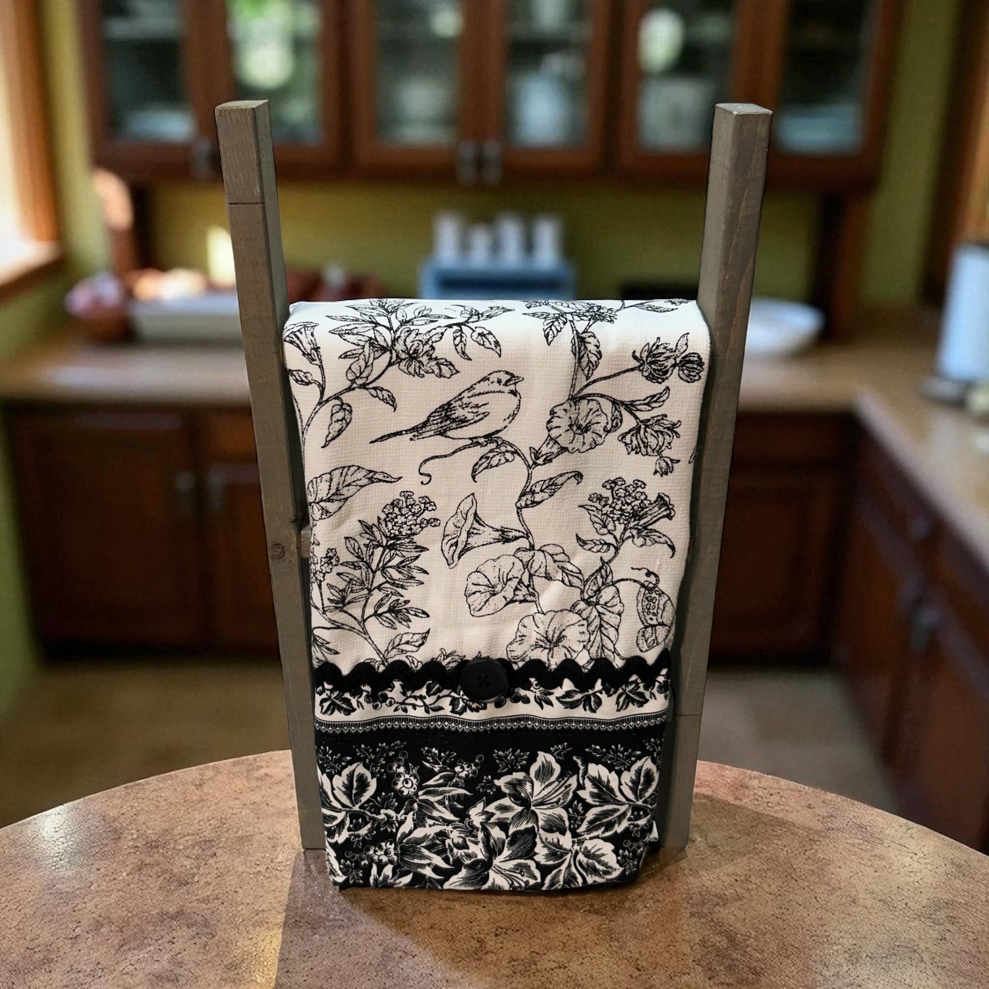 Add a touch of charm to your kitchen with this black and white cotton dish towel, featuring playful handcrafted accents. The delightful RicRac trim and button detail bring a whimsical flair while keeping your dishes dry and your cooking space stylish. Perfect for adding personality to everyday chores or as a gift that brightens any chef’s day.